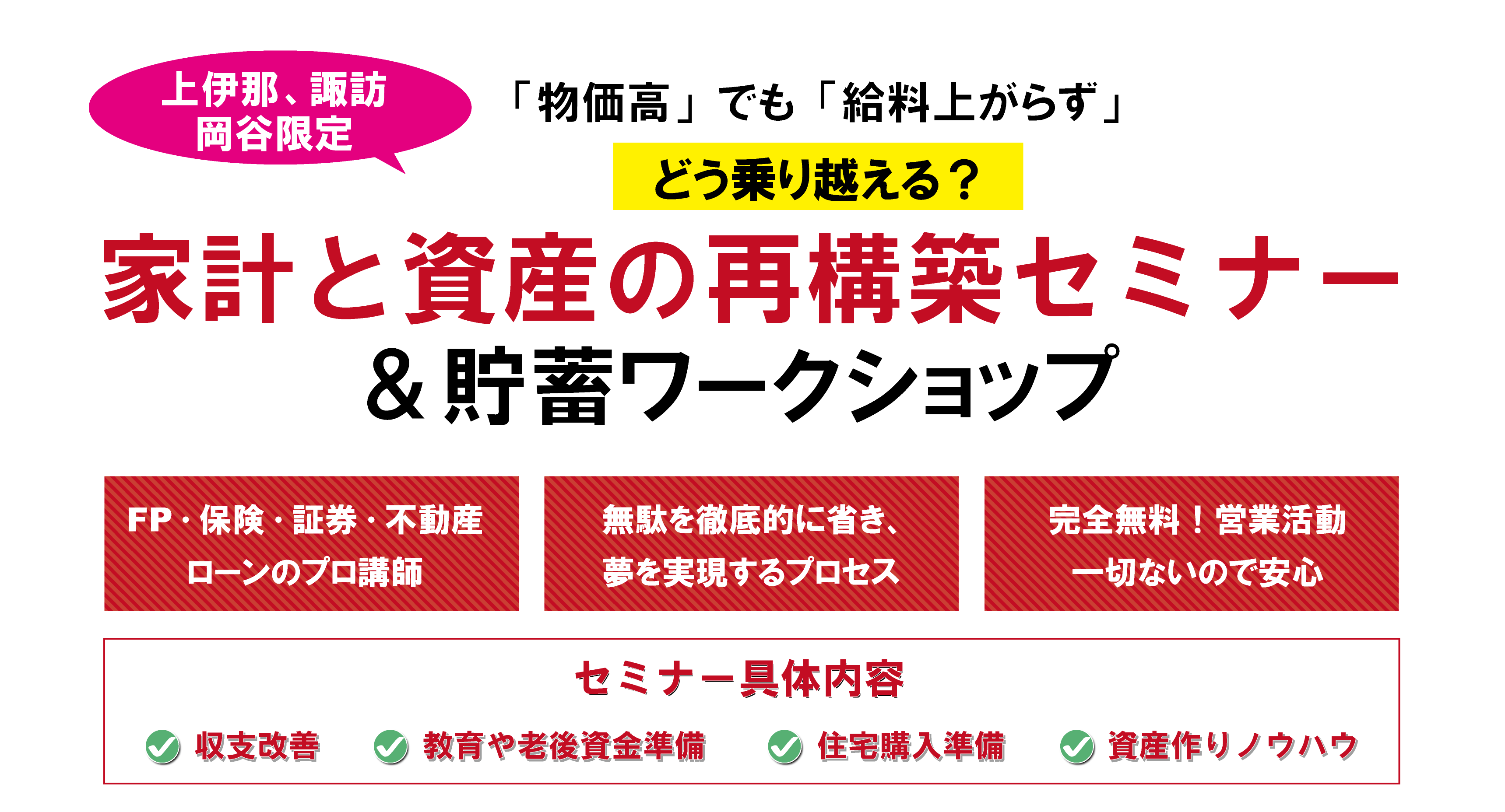 講師は住宅・保険・証券・ローンを取り扱うプロのFPです。何かの商品のPRではなく、家族がどうしたらこの時代幸せになれるかを真剣に伝える内容が他のセミナーとの違いです。
